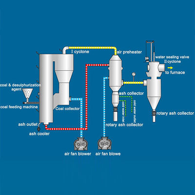 surowiec jest wprowadzany do gazyfikatora przez układ zasilający w celu prowadzenia reakcji pirolizy i gazyfikacji przy niewielkiej objętości powietrza wchodzącego z dna gazyfikatora.Energia wytworzona może pomóc utrzymać stabilną reakcję wewnątrz i przekształcić surowiec w gaz paliwowy i półkokWygenerowany gaz paliwowy zostanie zebrany przez separator cyklonów w celu wykorzystania w następnym etapie. The large amount of semicoke which is not fully reacted will be carried outside of the gasifier and resent to the gasifier by the return feeder for further reaction after separation through the primary cyclone separatorPopioły nieoddzielone przez podstawowy separator cyklonów zostaną wychwycone przez wtórny separator cyklonów i filtr workowy i wyemitowane przez system wyładowania popiołów.Warunki gazowania i czas pobytu surowca w gazowniku można zapewnić, ponieważ mamy naukowy projekt średnicy gazownikaTak więc surowiec jest przekształcany w paliwo gazowe, które potrzebujemy w sposób wydajny.